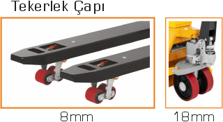 Dayanıklı gövde yapısı, hidrolik döküm pompası ile güçlü kaldırma imkânı sağlar. Poliüretan taşıyıcı tekerlekleri, sessiz ve uzun ömürlü kullanım sunarken zorlu zeminlerde bile kolay hareket ettirme imkânı verir. Ayrıca darbeye, vibrasyona ve suya karşı dayanıklılık özellikleri, transpaleti iç ve dış mekan kullanımlarında ideal hale getirir.