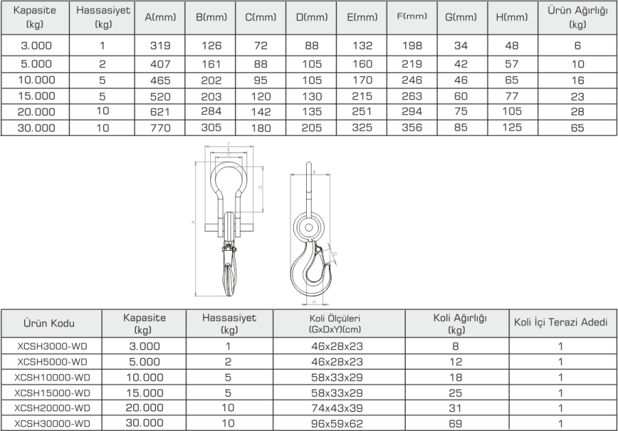 Tartım Kapasitesi: 3t / 1kg – 5t / 2kg – 10t / 5kg – 15t / 5kg – 20t / 5kg – 30t / 10kg