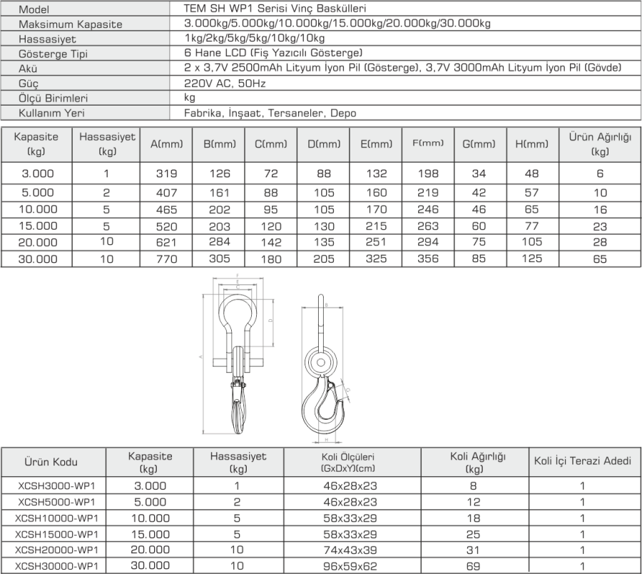 Tartım Kapasitesi: 3t / 1kg, 5t / 2kg, 10t / 5kg, 15t / 5kg, 20t / 5kg, 30t / 10kg